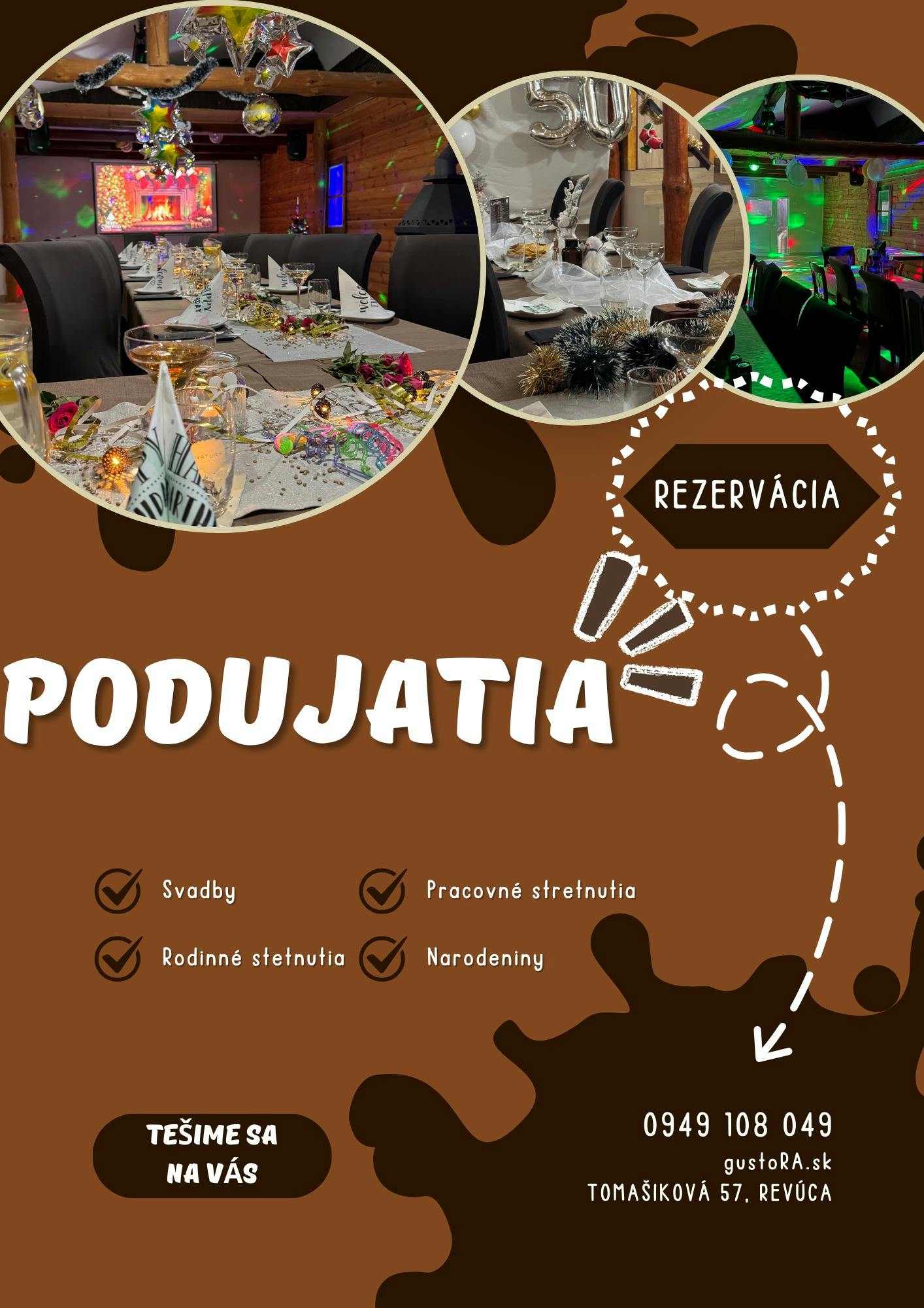 Hľadáte ideálne miesto na oslavu narodenín, rodinné stretnutie alebo firemné podujatie? Pizza&Restaurant Gusto vám ponúka možnosť usporiadania súkromných akcií v príjemných priestoroch s vynikajúcim jedlom a profesionálnym servisom. Okrem toho radi zabezpečíme aj catering na mieru tak, aby vaše podujatie bolo skutočne nezabudnuteľné. Stačí nás kontaktovať a my sa postaráme o všetko potrebné!